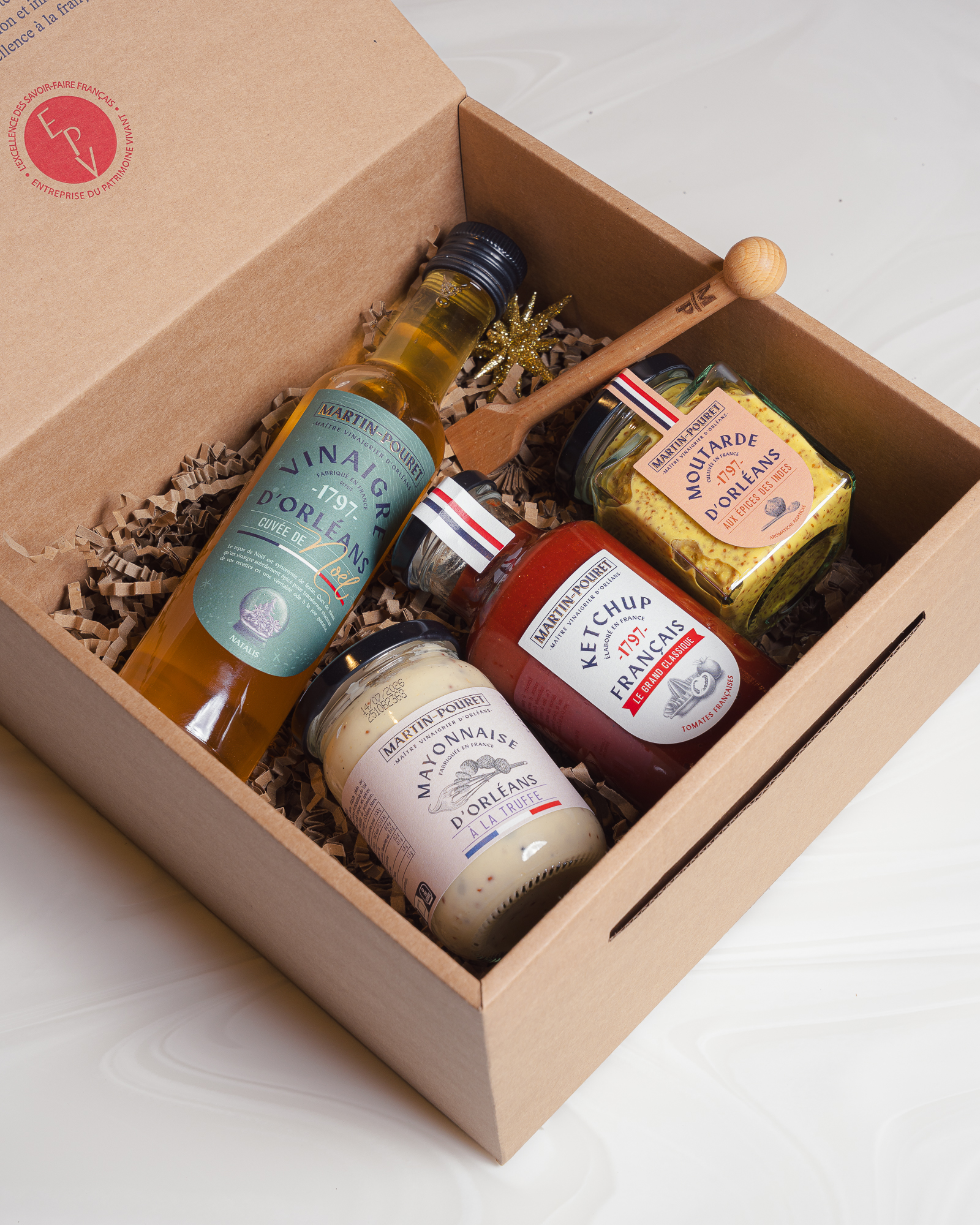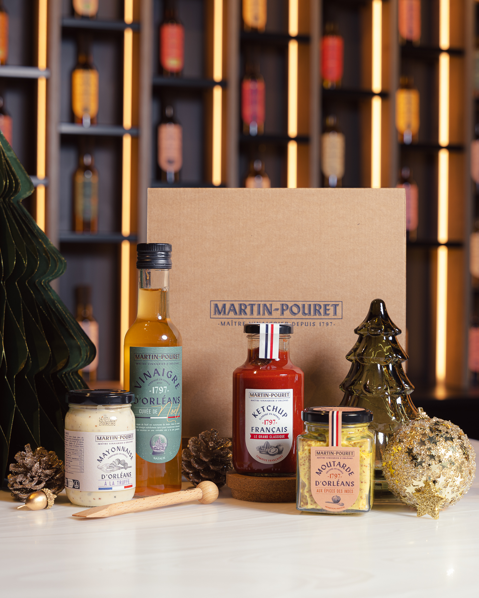 Celebrate the festive season with this exceptional gift set from Martin-Pouret, combining creativity and refined flavours. It includes a Christmas vintage vinegar, Indian spice mustard, a mustard spoon, truffle mayonnaise and classic ketchup.