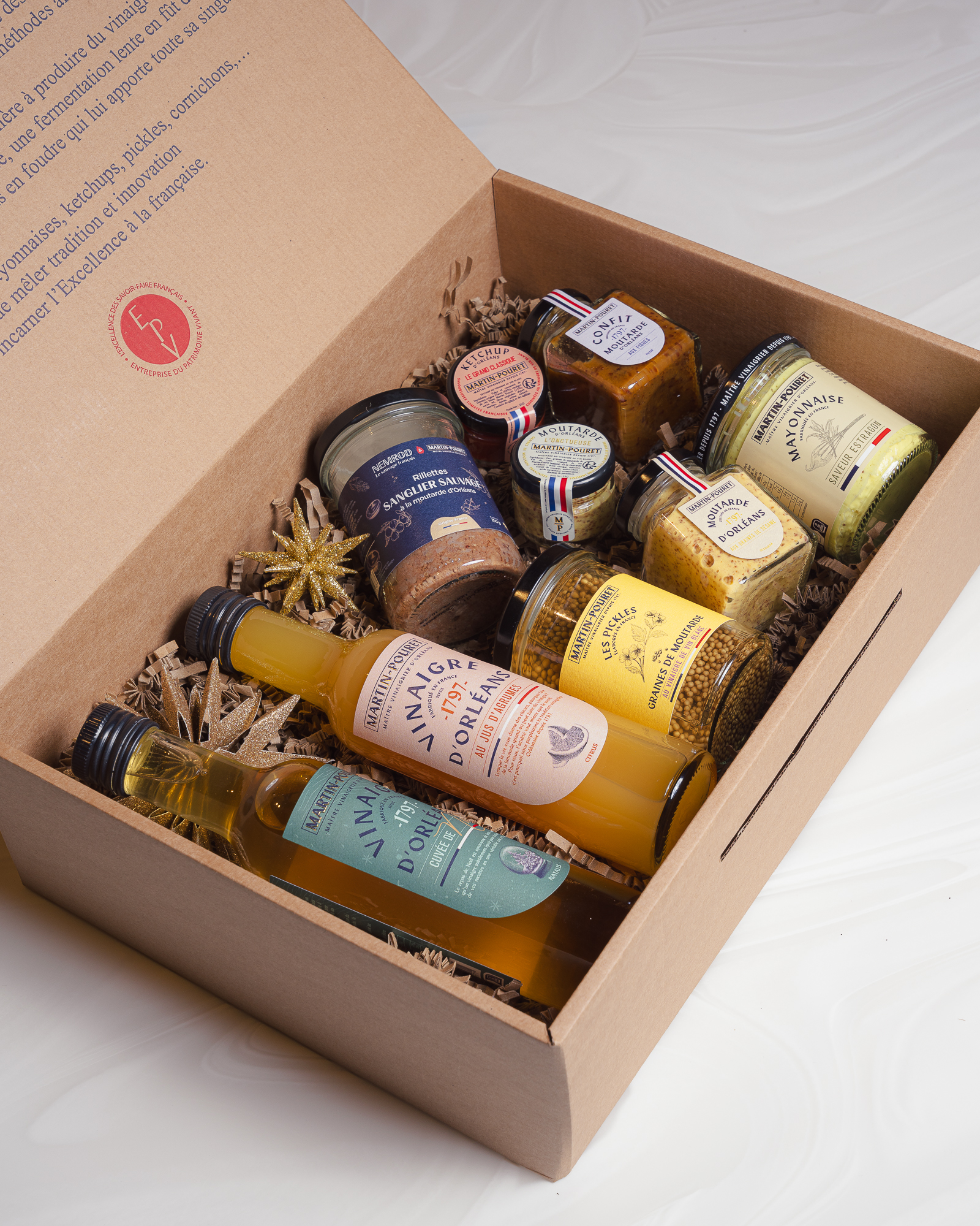Explore a journey of flavours with this exceptional Martin-Pouret gift set, where each product reveals the excellence of artisanal expertise. It includes citrus juice vinegar, Christmas Cuvée vinegar, mustard seed pickles, sesame mustard, 25g creamy mustard, wild boar terrine, tarragon mayonnaise, 22g ketchup mignonette and fig mustard confit.