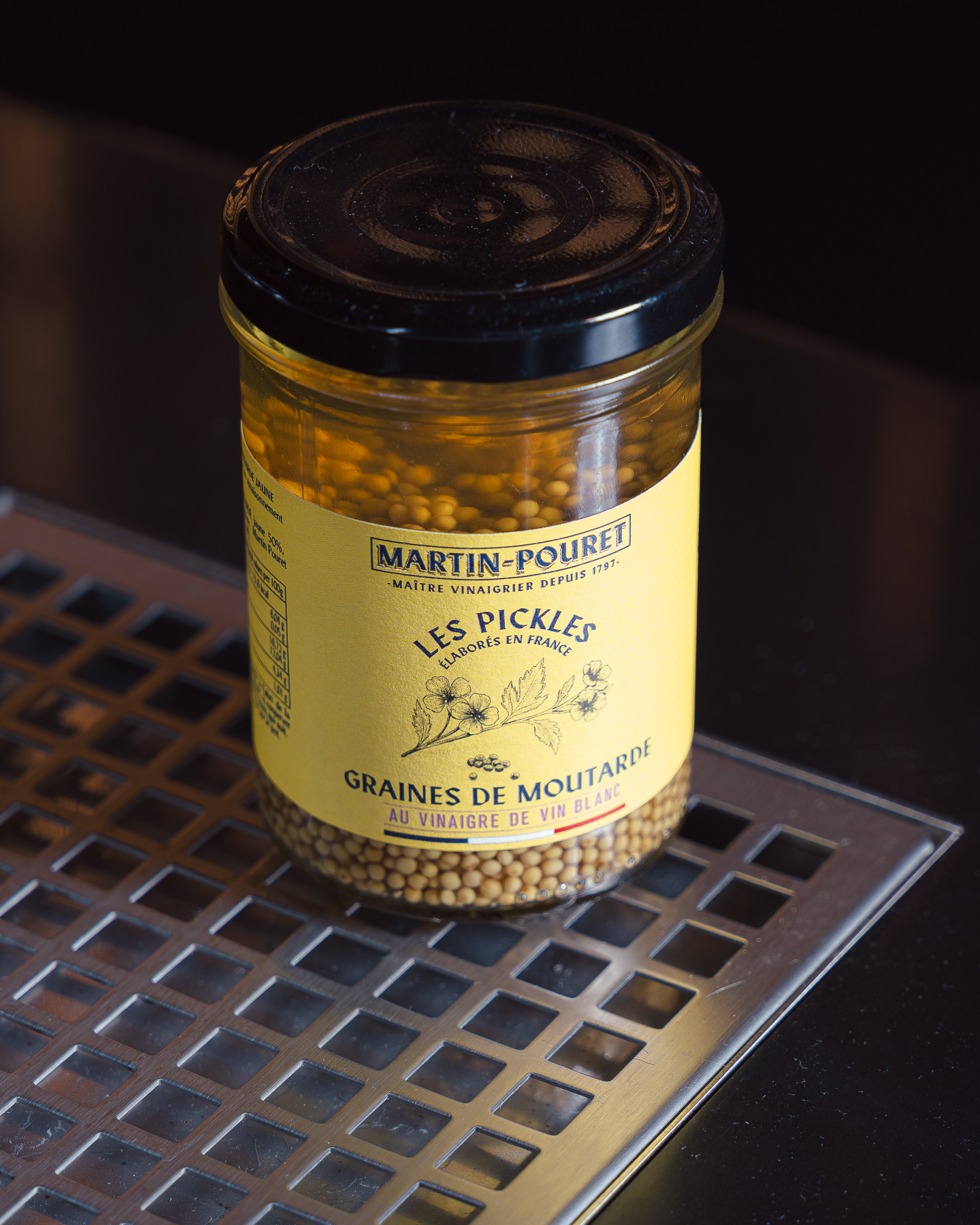 Graines de moutarde jaune 50%, saumure (vinaigre de vin blanc Martin-Pouret) (sulfites), sucre de canne, eau, sel).